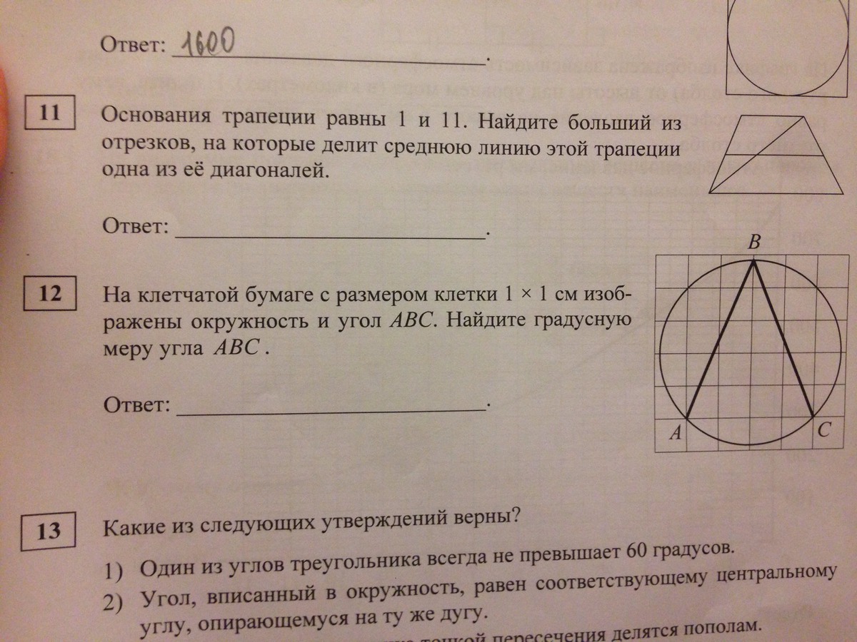11. Основания трапеции равны 1 и 11. Найдите больший из отрезков, на которые делит среднюю линию этой трапеции одна из её диагоналей.