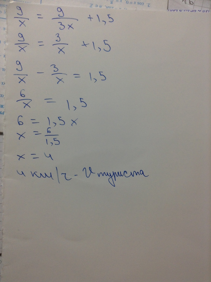 Из города в село вышел пеший турист. Через 1 час 30 минут вслед за ним вышел велосипедист, скорость которого в 3 раза больше чем у пешехода. Рассчитайте скорость туриста, если в село он пришел в одно время с велосипедистом. Расстояние между городом и селом равно 9 км.