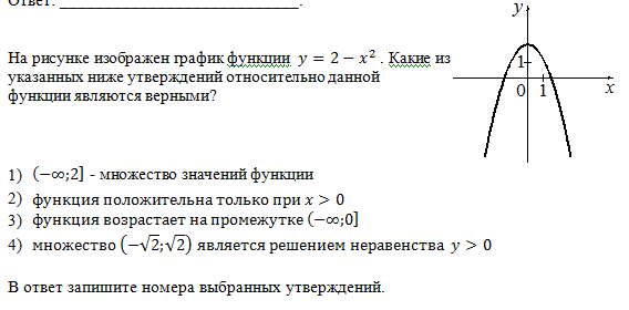 1-неверно( множество значений от минус до плюс бесконечности) 2-неверно (функция положительна от x=-1.5 (примерно) и до x=1.5) 3-верно( от минус бесконечности до x=0 игрик растет) 4-верно