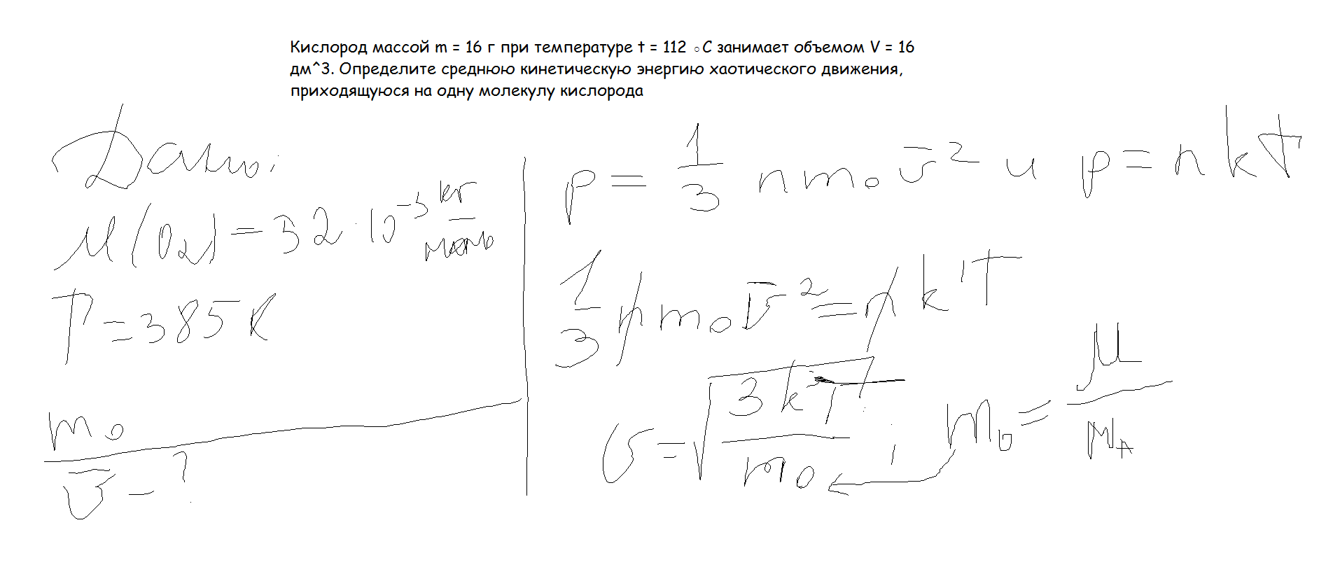 Кислород массой m = 16 г при температуре t = 112 ◦С занимает объемом V = 16 дм^3. Определите среднюю кинетическую энергию хаотического движения, приходящуюся на одну молекулу кислорода