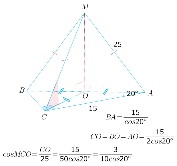 Треугольник ABC - прямоугольный ( угол С=90 градусов), угол А=20 градусов, AC=15 см. Точка М удалена на расстояние, равное 25 см, от каждой вершины треугольника. Найдите угол между МС и плоскостью АВС