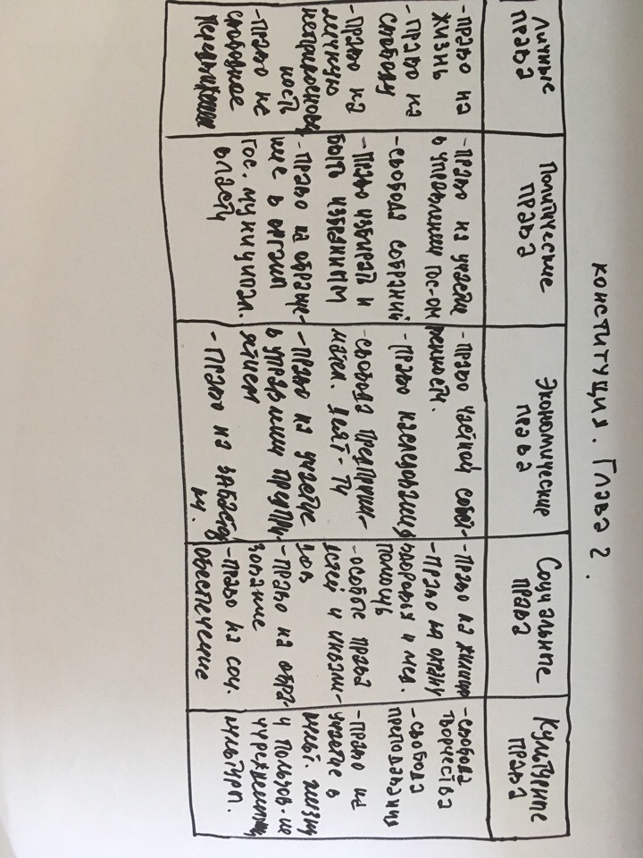 Нужно составить таблицу по теме конституция Глава 2 1)Личные права (Пример:Право на жизнь...) 2)Политические права 3)Экономические права 4)Социальные права 5)Культурные права