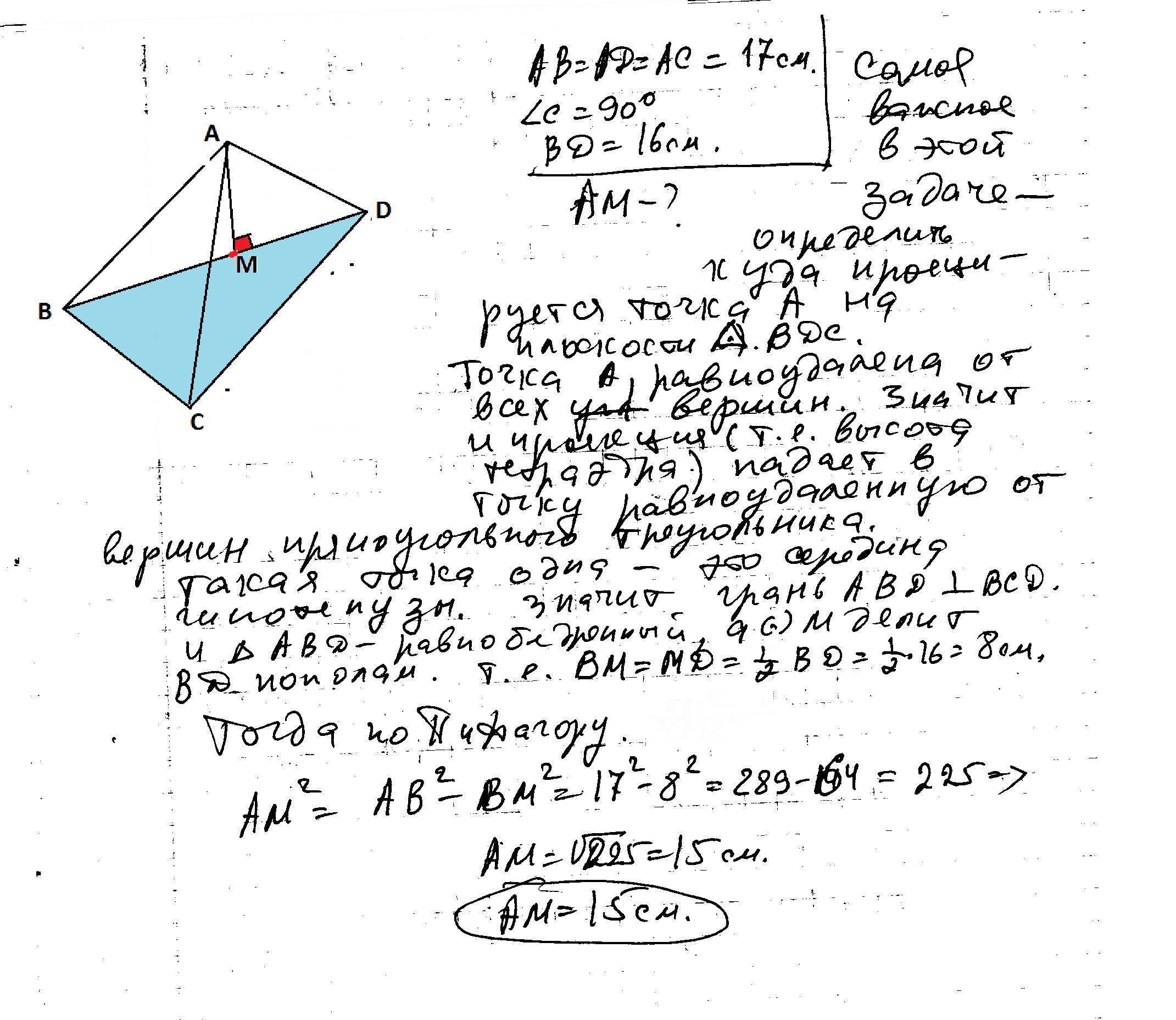 Расстояние от точки А, лежащей вне плоскости прямоугольного треугольника, до его вершин равно 17 см. Найти расстояние от точки А до гипотенузы этого треугольника, равной 16 см.