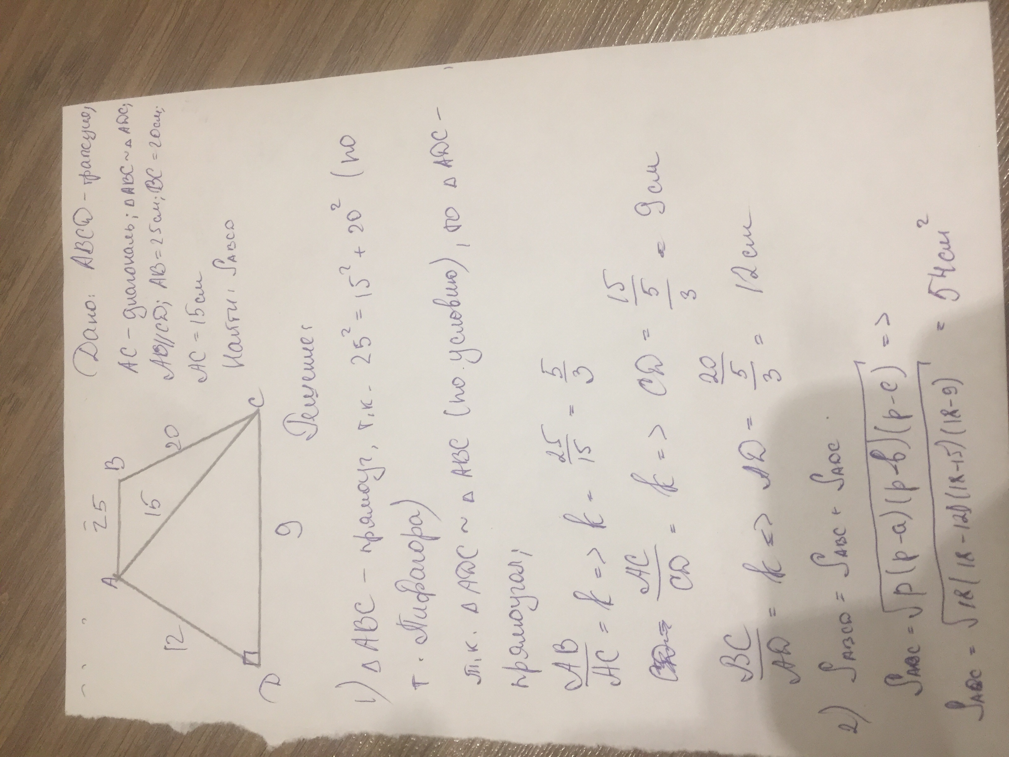 Диагональ AC трапеции ABCD делит ее на два подобных треугольника. AB||CD. Найдите площадь трапеции ABCD, если AB = 25cм, BC = 20 см, AC = 15см.