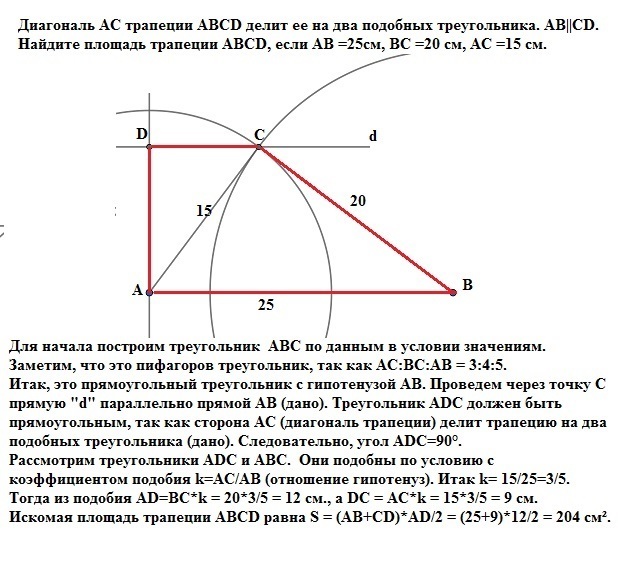 Итак, это прямоугольный треугольник с гипотенузой АВ. Проведем через точку С прямую "d" параллельно прямой АВ (дано). Треугольник ADC должен быть прямоугольным, так как сторона АС (диагональ трапеции) делит трапецию на два подобных треугольника (дано). Следовательно, угол АDC=90°.