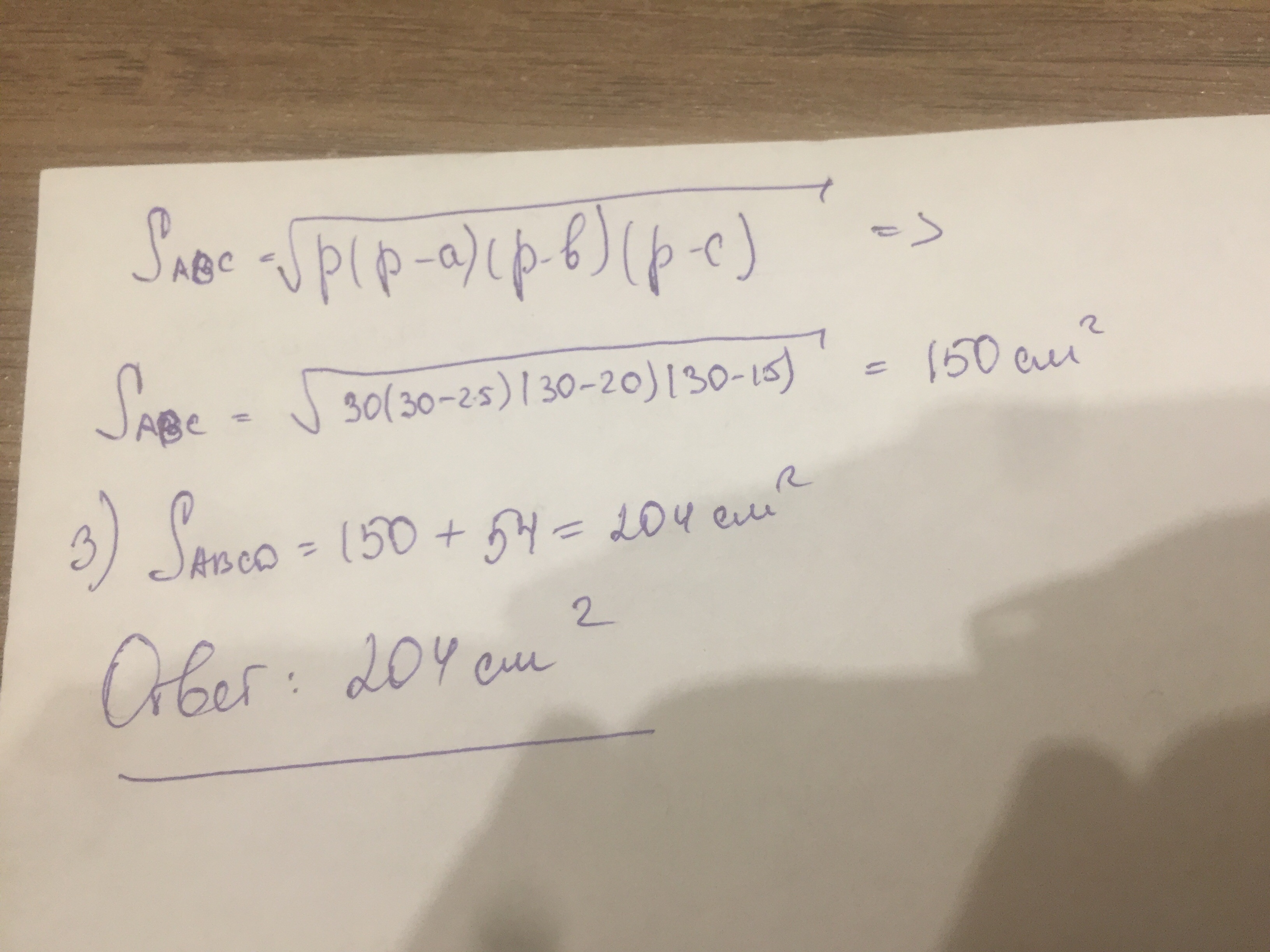 Искомая площадь трапеции АВСD равна S = (AB+CD)*AD/2 = (25+9)*12/2 = 204 см².