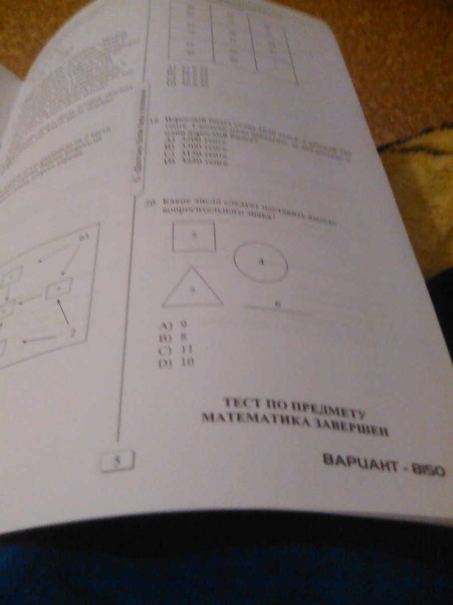 Какое число надо поставить вместо вопросительного знака (квадрат)7 (круг)4 (линия)6 (треугольник)? А)9 В)8 С)11 Д)10
