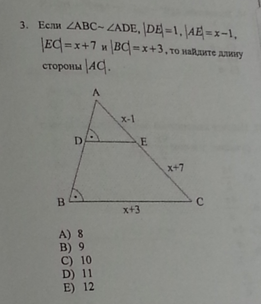 Если угол ABC подобен углу ADE, тогда треугольник ABC подобен треугольнику ADE по двум углам, угол A общий и ADE продобен ABC. Тогда составляем соотношение сторон: