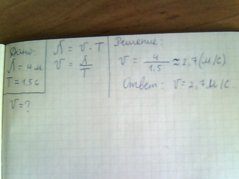 расстояние между соседними гребнями морских волн 4м. а период колебания лодки на волнах 1.5 с определите скорость волны