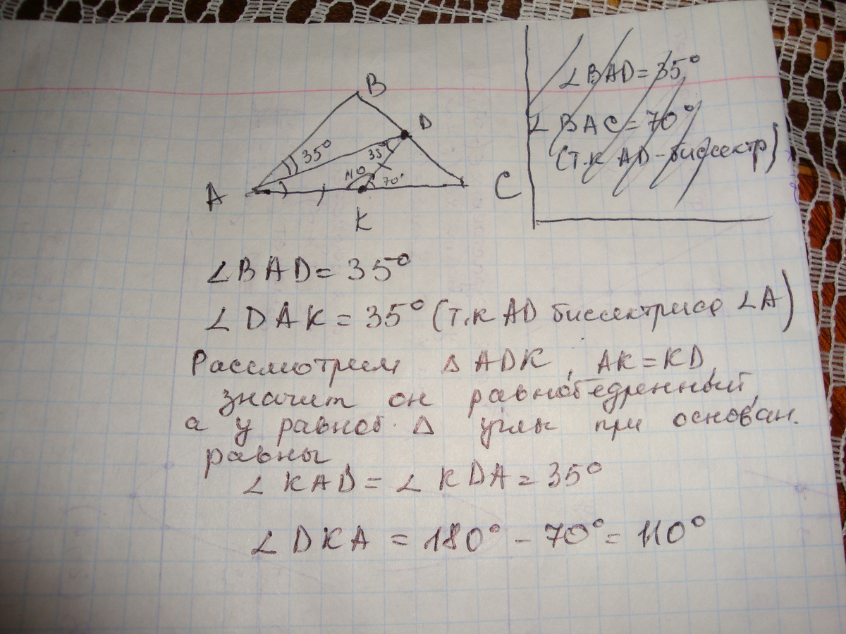 дано : отрезок AD биссектриса треугольника ABC , через D проведена прямая пересекающая сторону AC в точке К. так что DK = AK. найти все углы треугольника ADK если угол BAD =35 градусов. ПОМОГИТЕ ПЛЖАЛУЙСТА!!!!!!!!!!