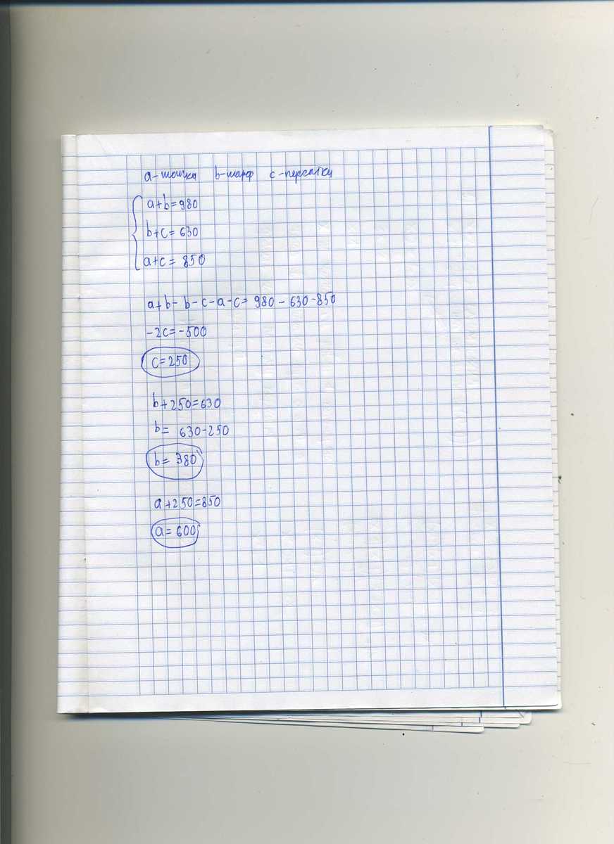 Были куплены шапка,шарф и перчатки.Шапка и шарф стоят 980тг,шарф и перчатки 630тг,шапка и перчатки 850тг.Какова цена шапки,шарфа,перчаток?