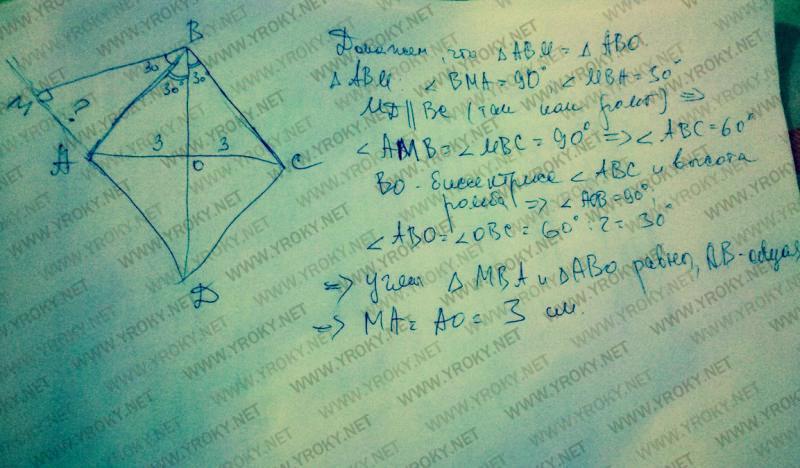 высота BM проведенная Из вершины угла ромба ABCD образует со стороной AB угол 30 градусов а м равно 4 сантиметра Найдите длину диагонали bd1 если точка М лежит на стороне AD