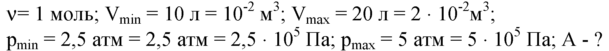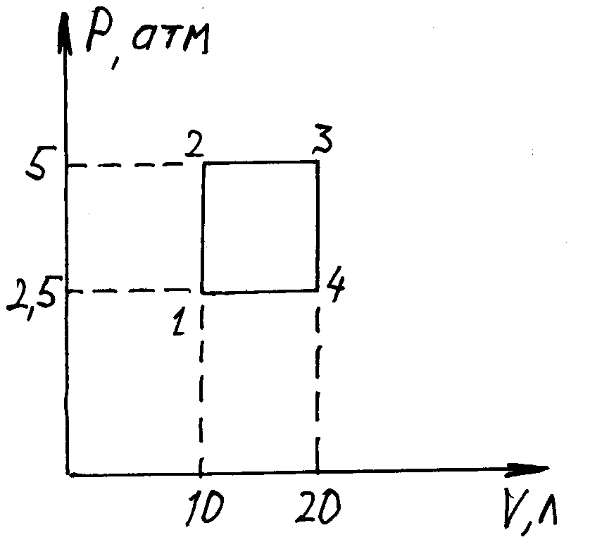 газ в количестве 1 моль совершает цикл, состоящий из 2 изохор и 2 изобар. наименьший объем газа 10л, наибольший-20л. наименьшее давление 2,5атм, наибольшее - 5 атм. наидите работу за цикл