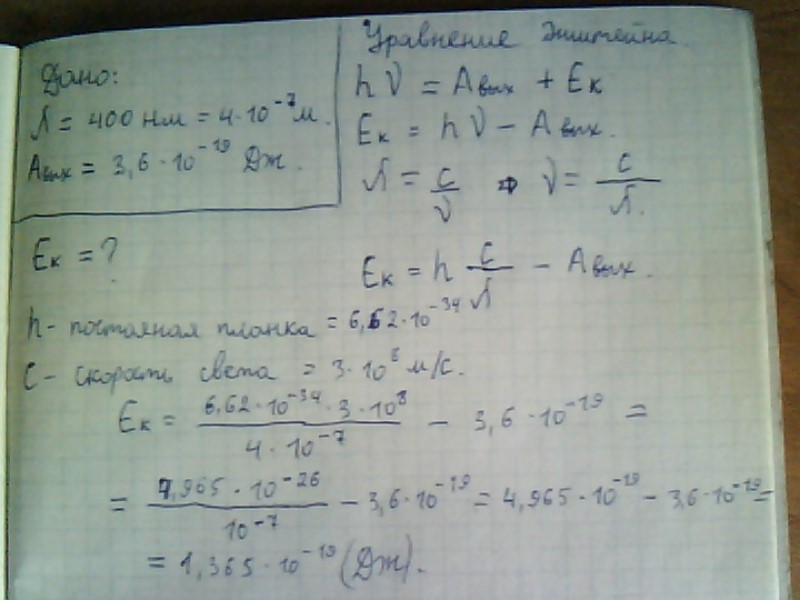 максимальная кинетическая энергия фотоэлектрона калия при его освещении светом с длинной волны 400 нм. если работа выхода электронов у калия равна 3,6*10 в минус 19 дж
