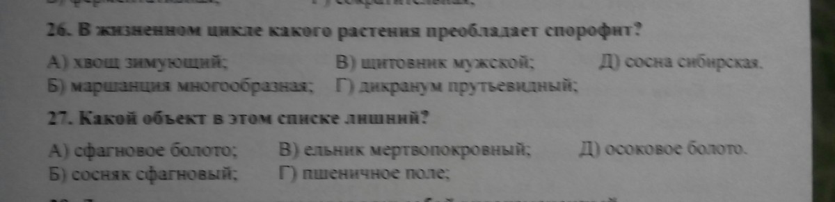 26. Маршанция и дикранум - это мхи, у них преобладает гаметофит, у остальных - спорофит. Ответ: А, В, Д