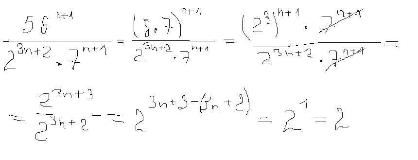 Сократите дробь: в числителе 56 в степени n+1, в знаменателе 2 в степени 3n+2 умножить на 7 в степени n+1