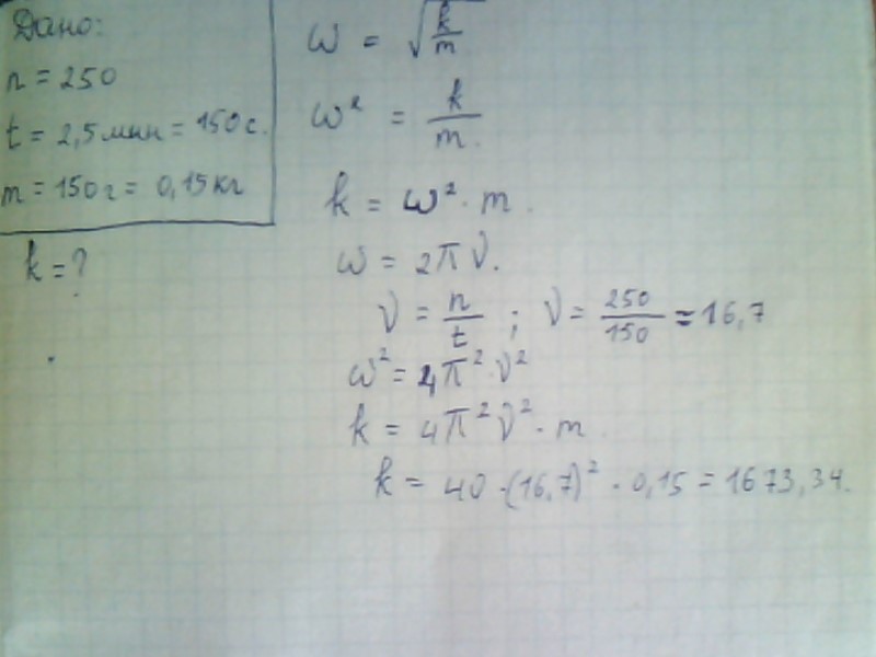 какую жесткость имеет пружина, на которой шарик массой 150 г совершает 250 колебаний за 2,5 мин.