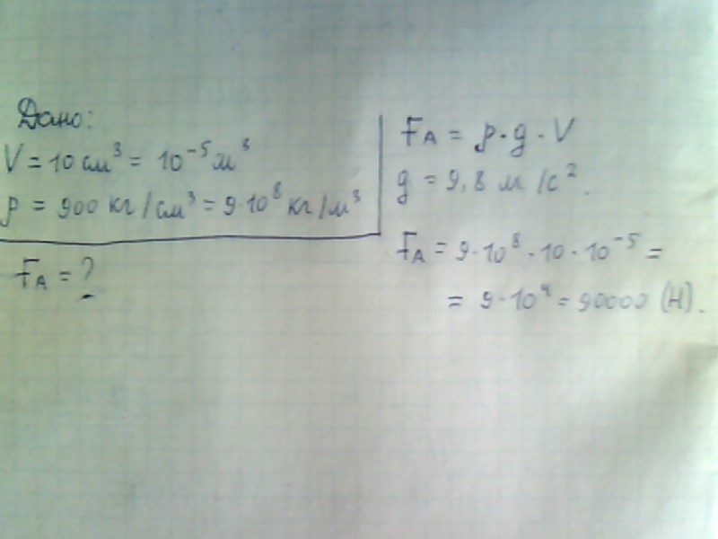 Определите силу Архимеда , которая действует на металлический цилиндр объёмом 10 см в кубе,погруженный в масло (ро масло = 900 кг/см в кубе.
