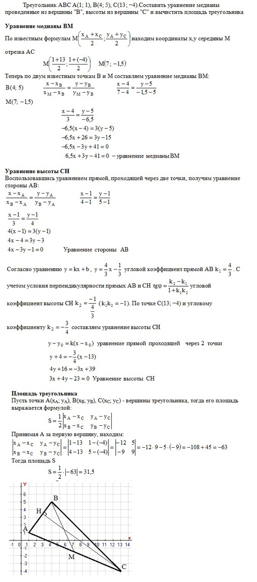 Треугольник АВС А(1;1),В(4;5), С(13;-4).Составить уравнение медианы проведенные из вершины "В",высоты из вершины "С" и вычистить площадь треугольника