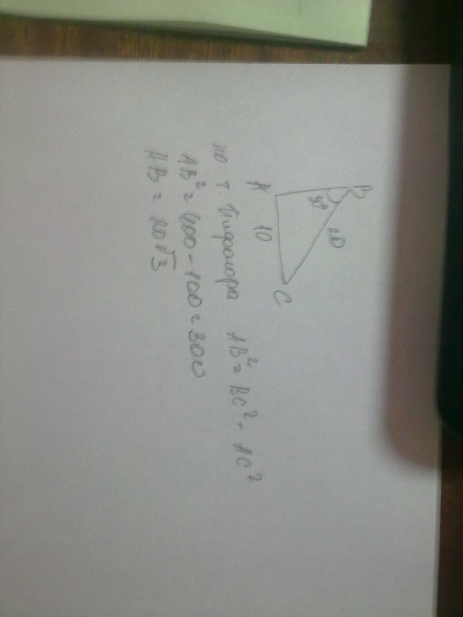 угол лещащий напротив угла 30 градусов равен половине гипотенузе, значит гипотенуза будет равна 20, отсюда по теореме Пифагора найдем второй катет 400-100=300 значит третьья сторона равна 20корней из 3.