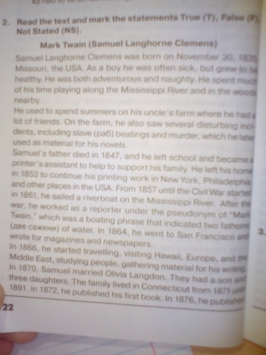 Сэмюэль Лэнгхорн Клеменс родился 30-ого ноября 1835 года в американском штате Миссури. Ребёнком он часто болел,но во взрослом возрасте стал здоровее. Он был предприимчивым и непослушным одновременно. БОльшую часть своего времени проводил,играя около Миссисипи или в лесах поблизости.