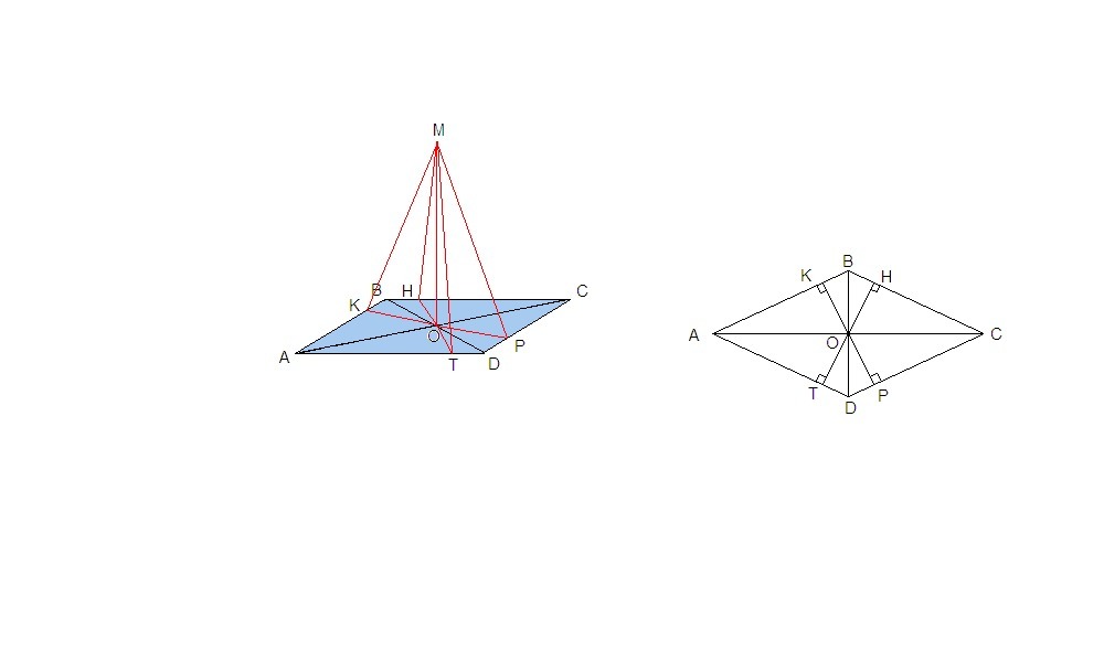 В ромбе проведем ОК, ОН, ОР и ОТ - перпендикуляры к соответствующим сторонам ромба. Эти отрезки - проекции наклонных МК, МН, МР и МТ на плоскость ромба. По теореме о трех перпендикулярах наклонные так же перпендикулярны сторонам ромба.