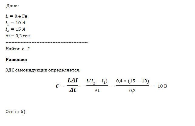 ЭДС самоиндукции в катушке с индуктивностью 0,4 Гн при равномерном уменьшении силы тока с 15 до 10 А за 0,2 с, равна________ В: а)0,4 б)10 в)50 г)0