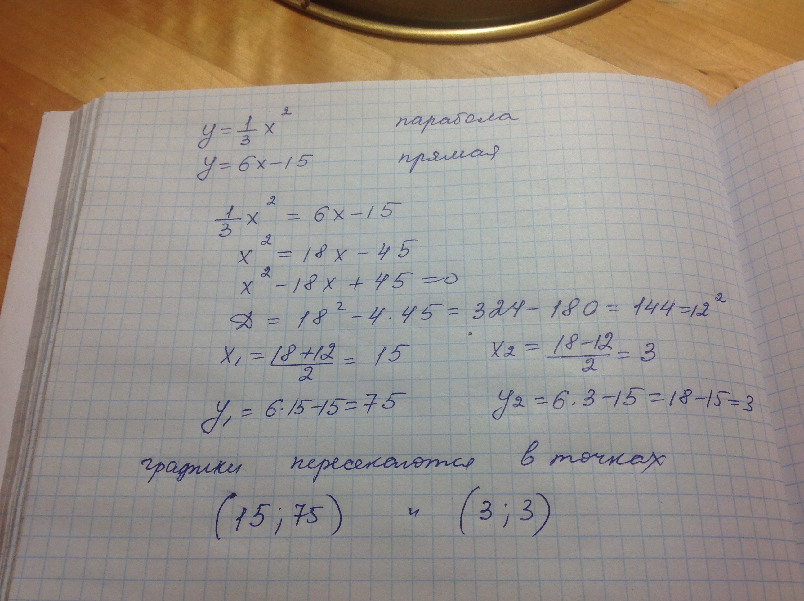 не выполняя построения,определите,пересекаются ли парабола y=1/3x2 и прямая у=6x-15 если точки пересечения существуют ,то найдите их координаты