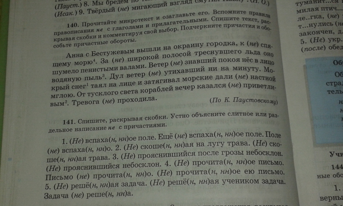 номер 140 Неспящее море. К не спящему морю(причастие),за неширокой и словосечания треснувшего льда с обеих сторон выделяем запятыми(потому что это причастный оборот),не знавший (причастие) и не знавший покоя с обеих сторон выделяем запятыми(прич. об.),не утихавший и после дул ветер ставим запятую (потому что потом идёт прич. об.),ненастной (прил.пишем слитно потому что без не не произносится),неприветливым ,не проходила.