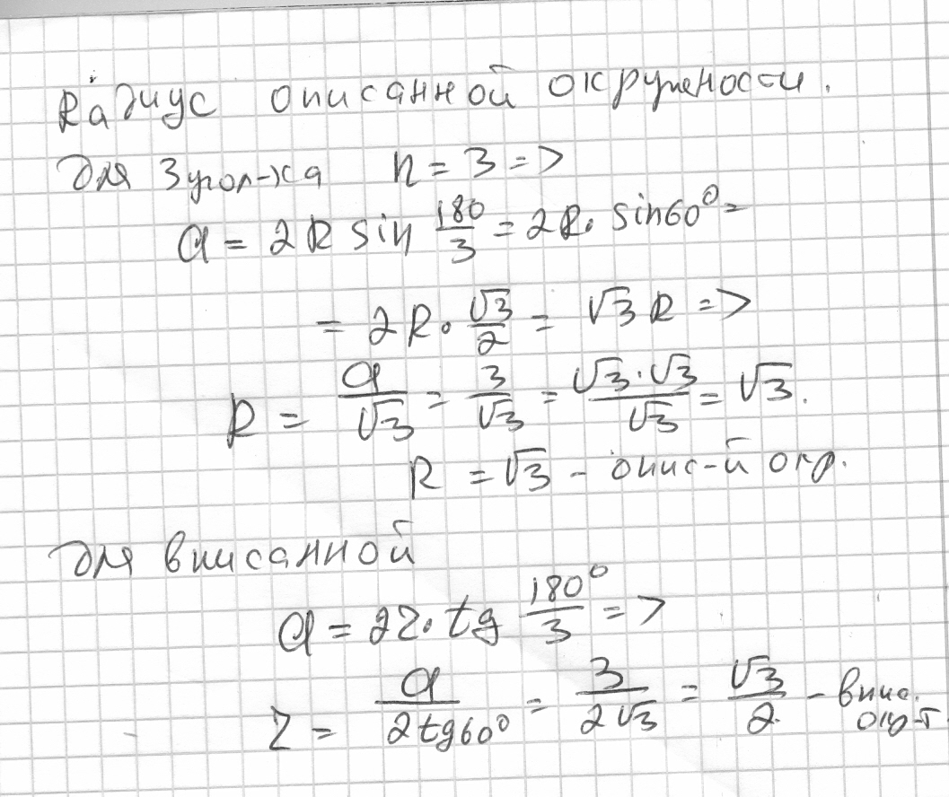 Сторона правильного треугольника равна 3 см. Найдите радиус: 1) описанной окружности; 2) вписанной окружности. Формулы: an=2Rsin180/n an=2rtg180/n