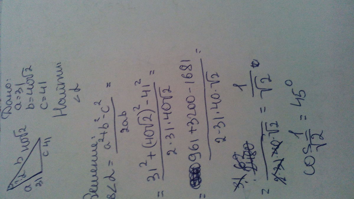 2-Даны три стороны треугольника a=31, b=40√2, c=41. Найдите угол, противолежащий стороне с.