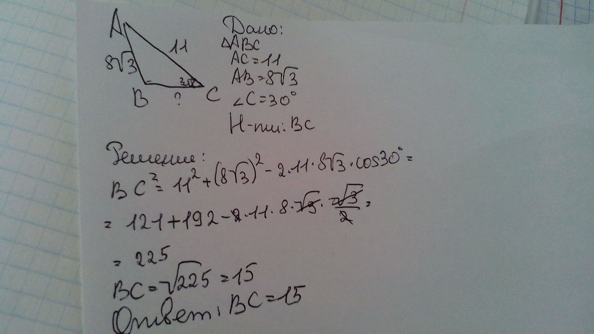 1-Даны две стороны треугольника а=11, в=8√3 и ∠С=30°, противолежащий третьей стороне. Найти третью сторону с.
