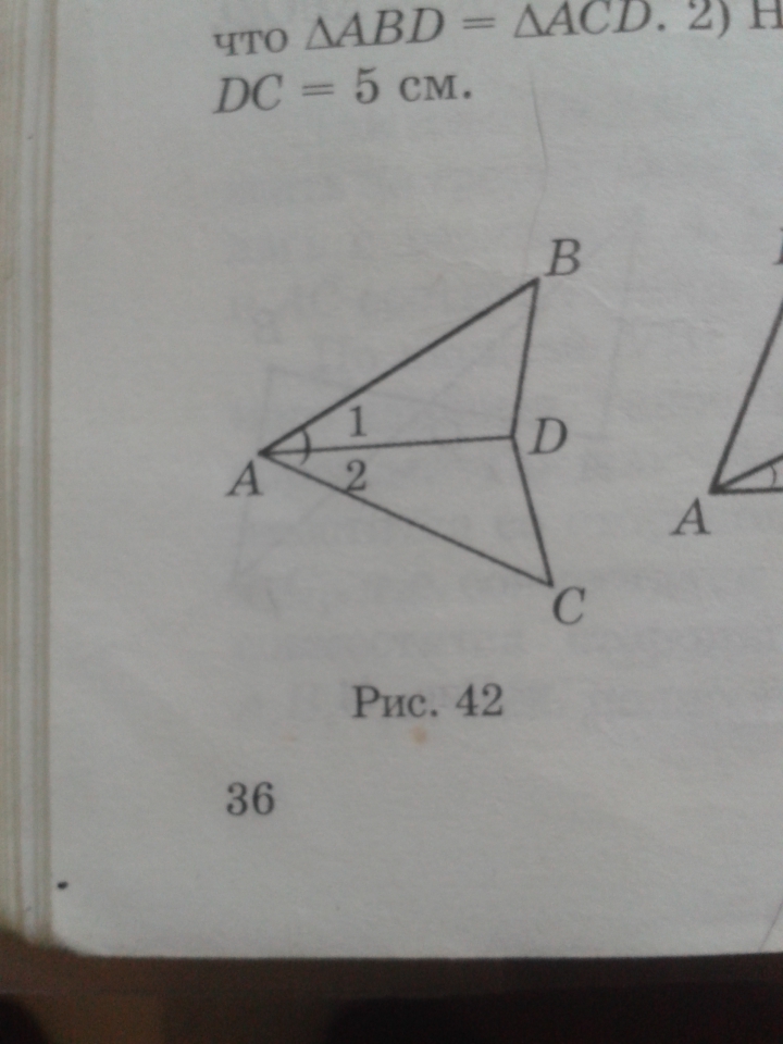 Так как две стороны одного треугольника (АВ и АД) и угол между ними (угол 1) равны двум сторонам АС и АД) и углу между ними (угол2) другого треугольника, то по первому признаку равенства треугольников эти треугольники равны, следовательно ВД=ДС=5 см.