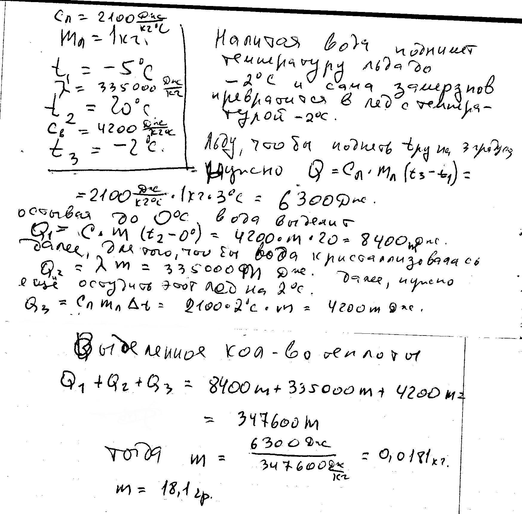 В калориметре находится 1 кг льда при температуре -5 C (268 К) .Какую массу воды,имеющей температуру 20 С (293 К), нужно добавить в калориметр,чтобы температура его содержимого после установления теплового равновесия оказалась - 2 С (271 К) . Теплообменом с окружающей средой и теплообменом калориметра пренебречь.