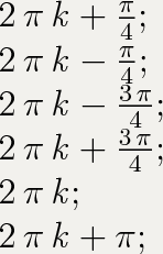 Ответ:(Решение уравнения с учётом ОДЗ )x ∈ {2*пи*k, 2*пи*k-3*пи/4, 2*пи*k-пи/4, 2*пи*k+пи/4, 2*пи*k+3*пи/4, 2*пи*k+пи}, k ∈ Z