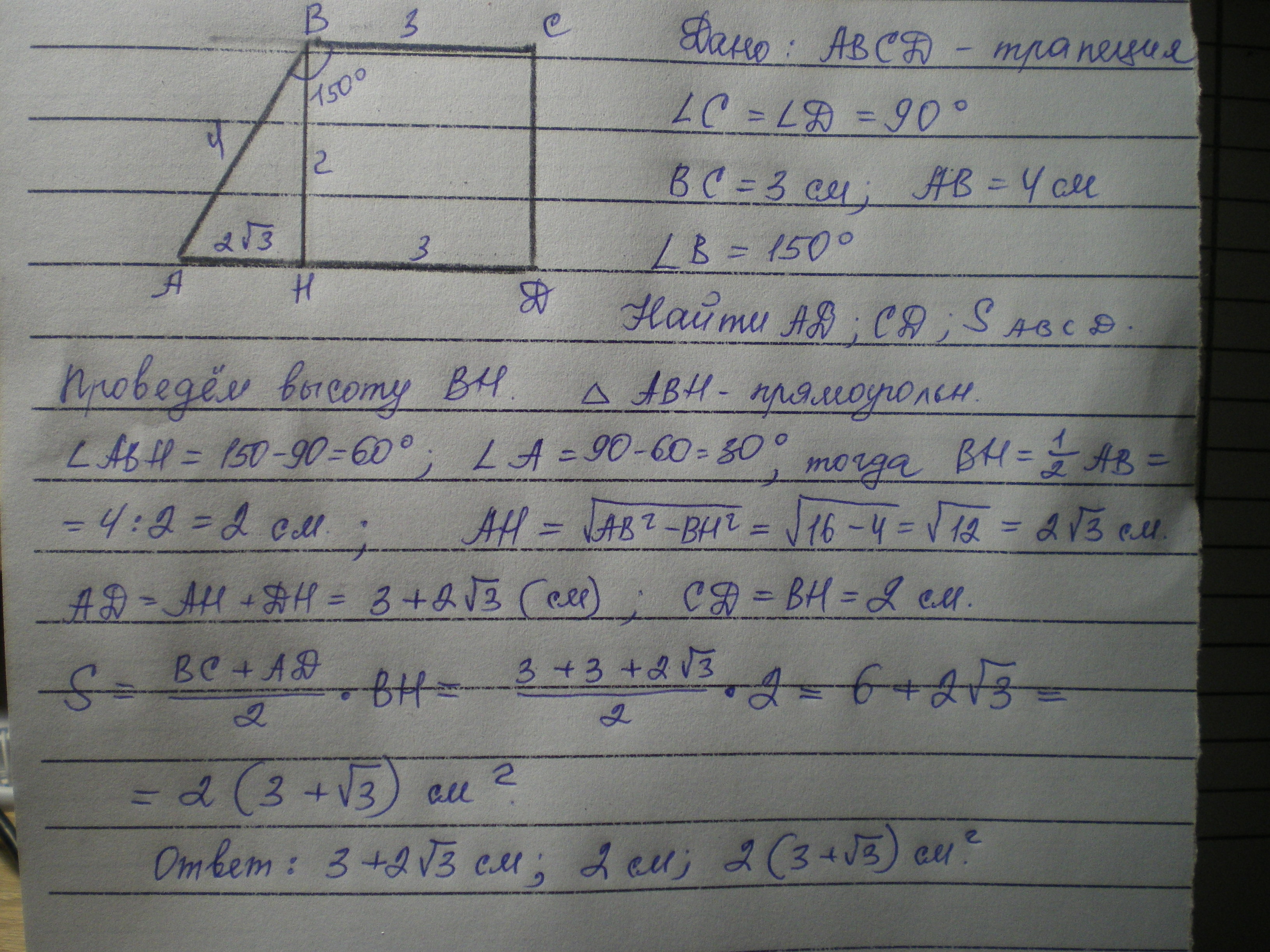 ABCD - прямоугольная трапеция. BC=3, AВ=4, угол B=150 градусам. Найдите AD, CD, площадь трапеции.
