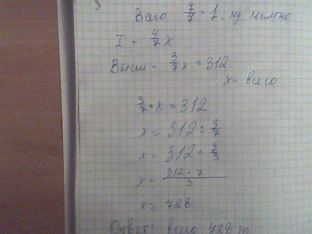 В магазин привезли муку высшего и первого сорта. Первого сорта привезли 4/7 от всего количества муки, а высшего 312 т. Сколько всего муки привезли в магазин?