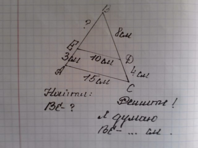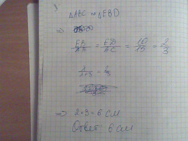 В подобных треугольниках все через отношения решать. Т.к. одна треть от АВ равна 3, то АВ равно 9, а ЕВ равно 9-3=6 см.