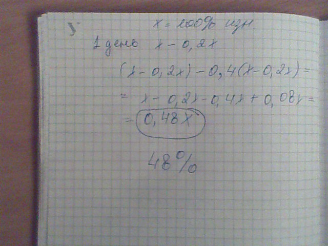 во второй день осталось 0,8х*0,6=0,48х, т.е. 48%