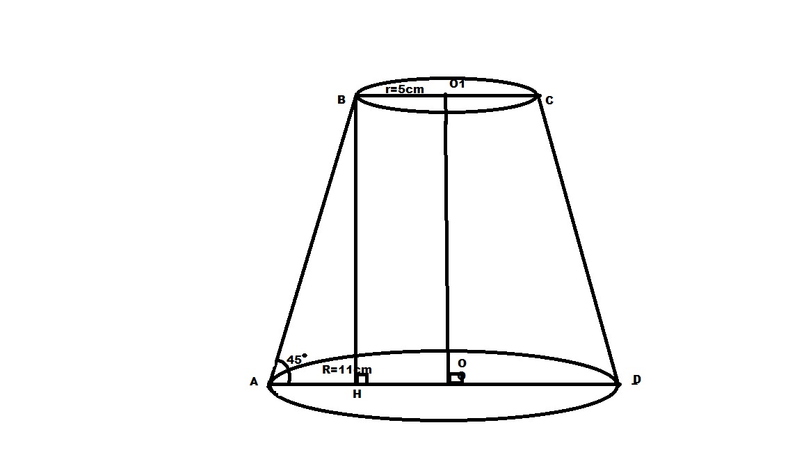 Знайти твірну зрізаного конуса, у якого радіуси основ дорівнюють 5 і 11 см, а кут між твірною і висотою 45 градусів.