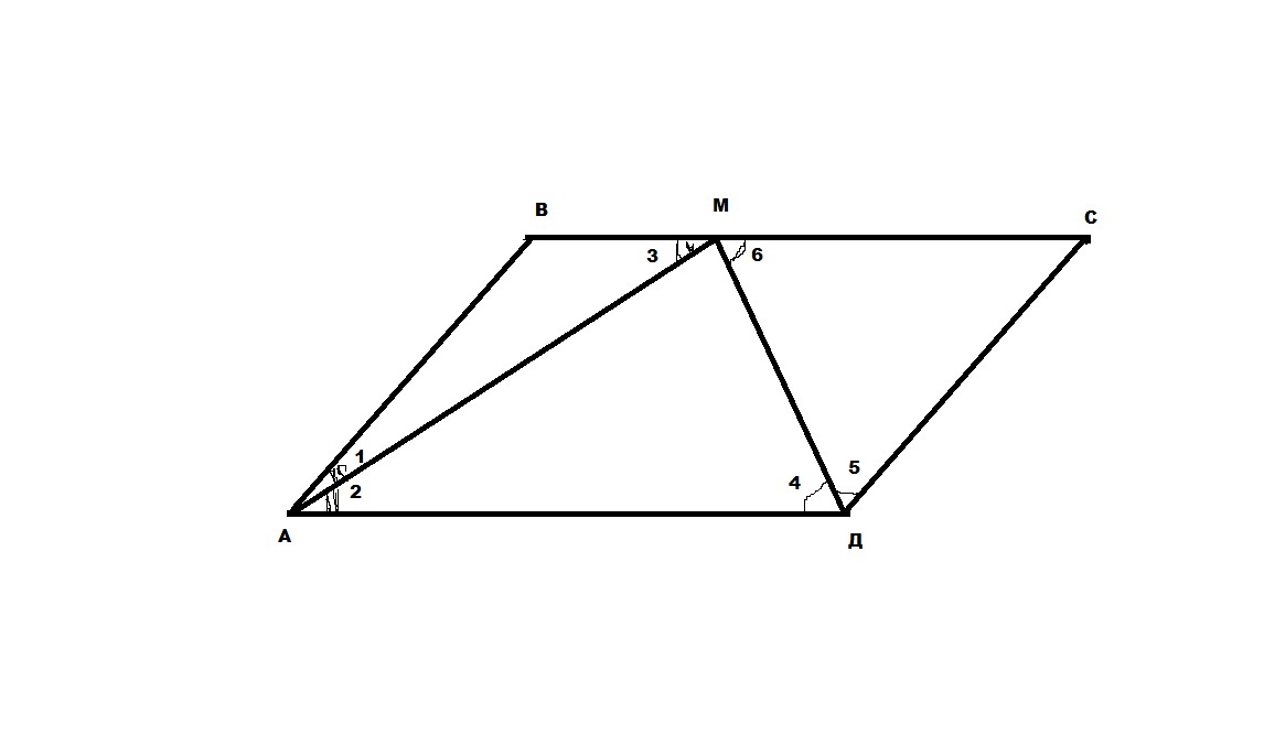 рассмотрим АД иВС -паралельны, АМ- секущая уг3=уг2 как внутр разносторонние, значт1=2=3. следовательно АВМ равносторонний АВ=ВМ