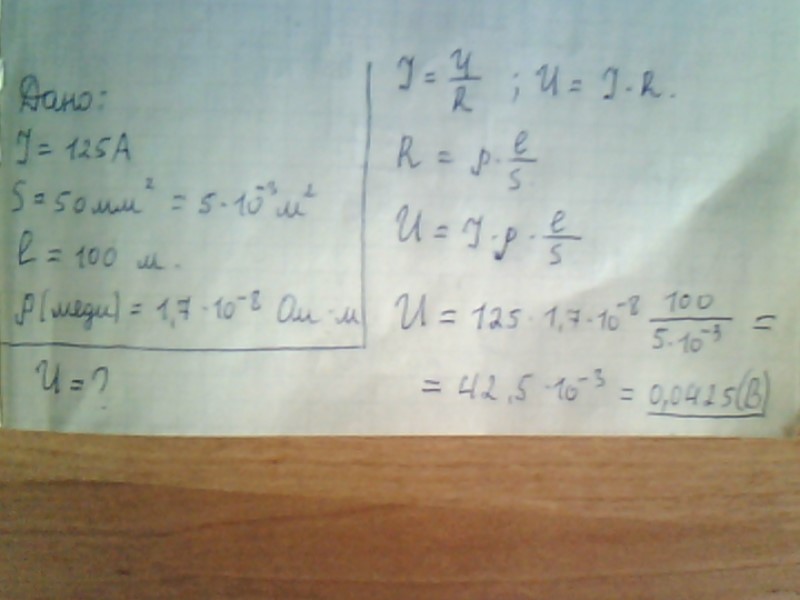 Помогите пожалуйста решить задачу по физике)) Сварочный аппарат присоединяют в сеть медными проводами длиной 100 м и площадью поперечного сечения 50 мм2. Определите напряжение на проводах, если сила тока в них 125 А.