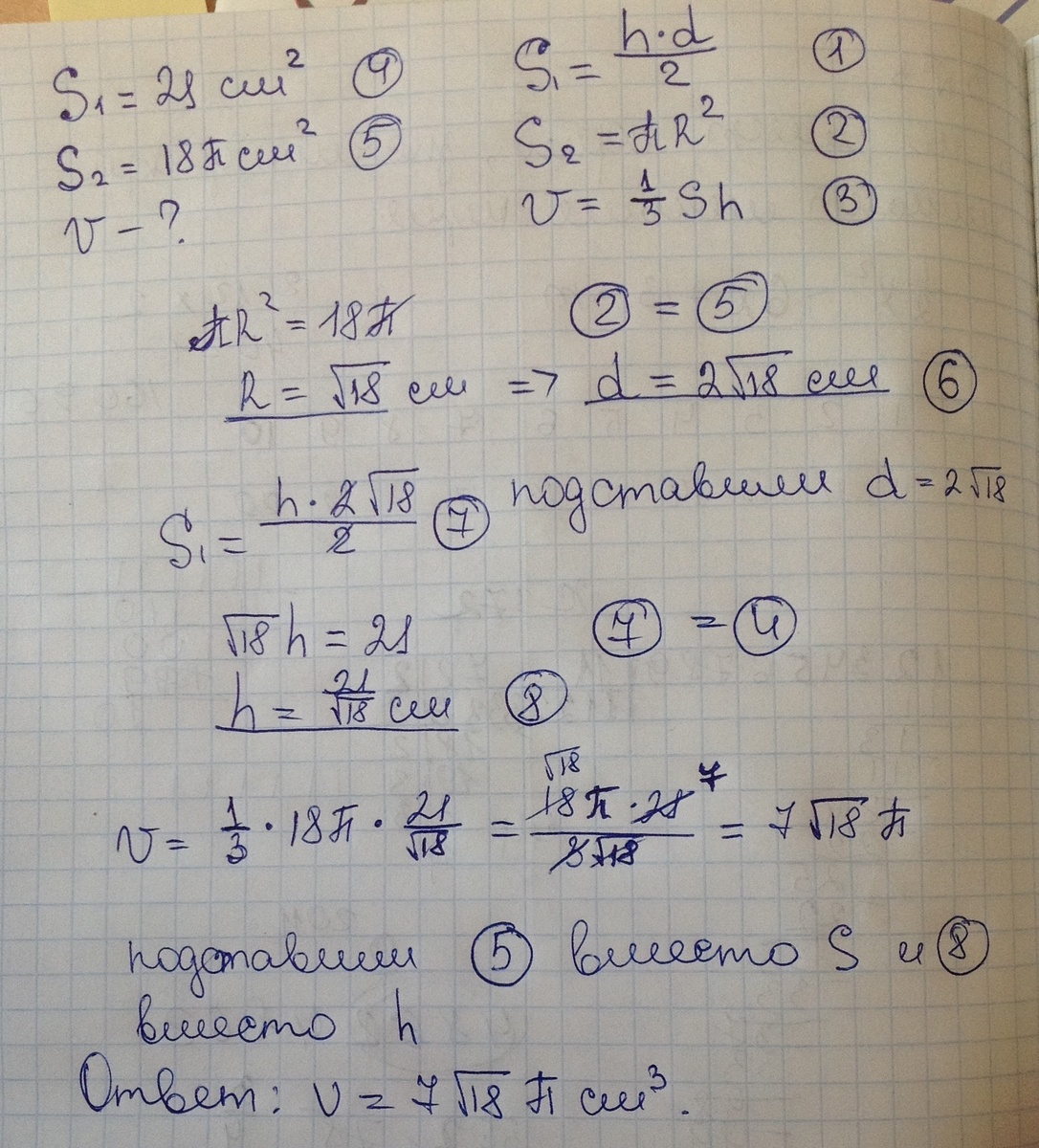 дан конус. площадь осевого сечения 21 см в квадрате. площадь основания 18 п см в квадрате. найти объем конуса