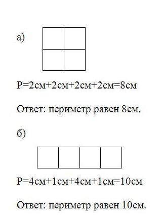 Начерти квадрат со стороной 1 см. Составь из 4 таких квадратов: а) квадрат; б) прямоугольник. Найди периметр каждой фигуры