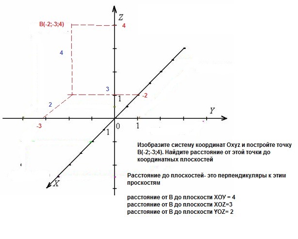 Изобразите систему координат Oxyz и постройте точку B(-2;-3;4). Найдите расстояние от этой точки до координатных плоскостей