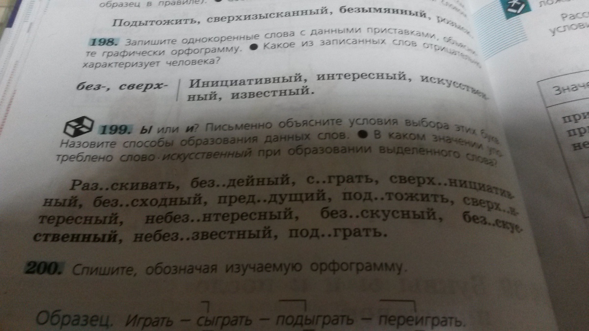 Разыскивать, безыдейный, сыграть, сверхинициативный, безысходный, предыдущий, подытожить, сверхинтересный, небезынтересный, безыскусственный, небезызвестный, подыграть. Безыскусственный- значит не причастен к чему либо(не имеешь никакого отношения). Если приставки оканчиваются на согласную, то вместо И пишется Ы.