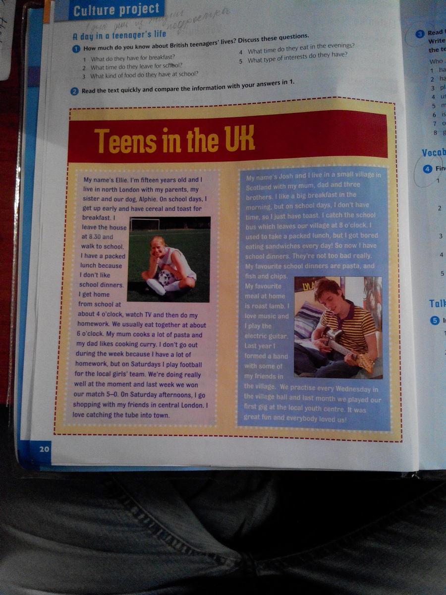 Моё имя Элли. Мне 15 лет и я живу в серевном Лондоне с моими родителями, моей сестрой и рашей собакой. Альфи. В школьные дни, я просыпаюсь рано и ем кашу с бутербродами на завтрак. Я выхожу из дома в 8:30 и иду в школу. У меня завёрнутый обед с собой потому что я не люблю школьные обеды. Я прихожу домой примерно в 4 часа, смотрю телевизор и после делаю мою домашнюю работу. Мы обычно кушаем вместе примерно в 6. Моя мама готовит много пасты и мой папа любит готовить . Я не выхожу из дома напротяжении каникул потому что у меня много домашней работы, но по Субботам я играю в футбол в национальной юношеской команде. Мы делаем всё хорошо в наше время и в прошлую неделю мы выиграли матч со счётом 5-0. Завтра, в Субботу, я пойду на шоппинг с моими друзьями в центр Лондона.