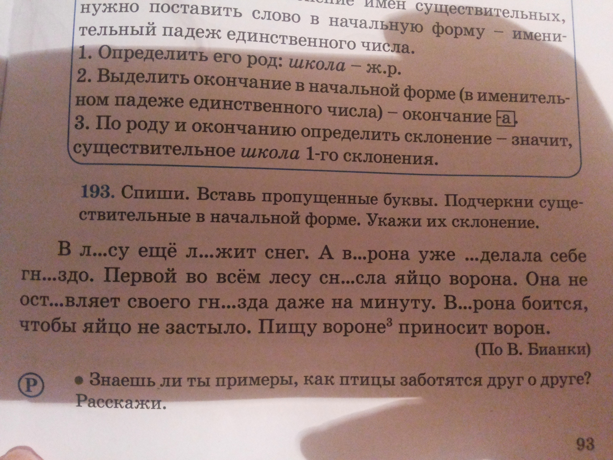 В лесу ещё лежит снег(сущ.2 склонение).А ворона сделала уже себе гнездо(сущ.к сожалению не помню склонение).Первой во всём лесу снесла яйцо(сущ.2 склонение.) ворона.Она не оставляет своего гнезда даже на минуту.Ворона(сущ.1 склонение) боится , что бы яйцо(сущ.2 склонение) не застыло.Пищу вороне приносит ворон(сущ.2 склонение).