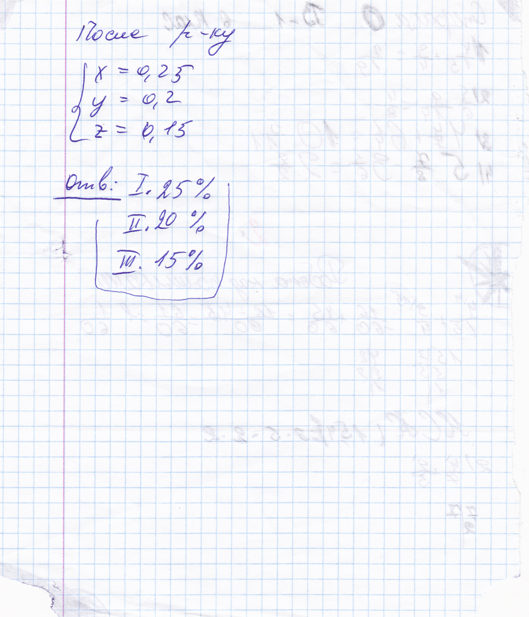 сумма возросла до 725000. если бы 1/6 вклада вложили в 1й банк,2/3 во 2й, и остаток в 3й, то вклад увеличился бы до 720000р. а если бы 1/2 вклада в 1й банк, 1/6 во второй банк, и остаток в 3й то получили 725000р. Какой процент выплачивает каждый банк?
