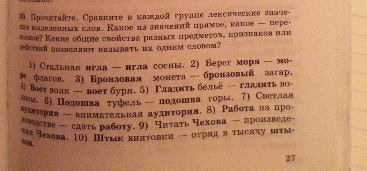 Прочитайте . Сравните в каждой группе лексические значения выделенных слов. Какое из значений прямое , какое - переносное ? Какие общие свойства разных предметов, признаков или действий позволяют называть их одним словом ?
